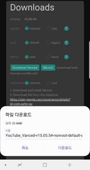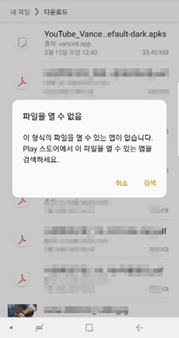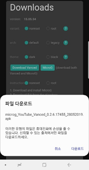 다운로드한 파일 목록으로 가보면 유튜브 밴스드와 Micro G가 있습니다. 이 APK를 설치를 누르면 경고창이 뜨는 분들이 있을 거예요. 보이스피싱이나 루팅, 해킹에 이용되는 불법 프로그램의 임의설치를 막기 위한 조치 때문에 설치가 안될 겁니다. 이런 경우 폰 설정 항목에서 "출처를 알 수 없는 앱 설치"항목에서 비활성화를 시켜주시면 자동 설치가 됩니다.