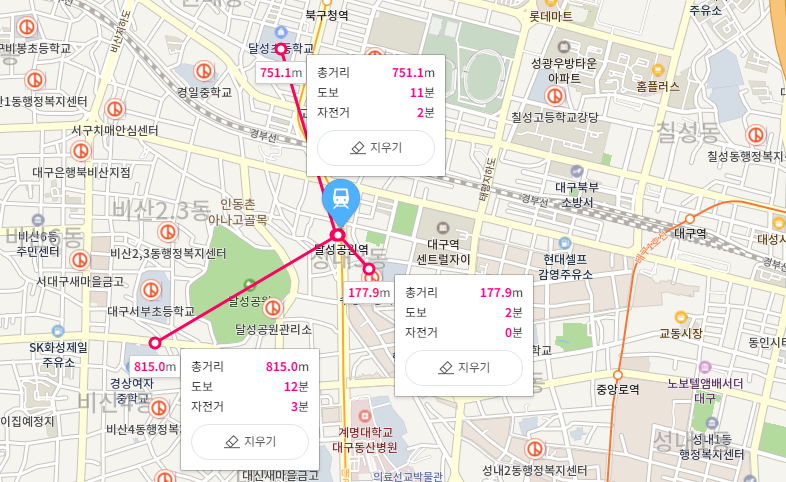중구(녹색 영역)와 북구(붉은색 영역) 를 모두 이용할 수 있는 생활권으로 입지는 우수합니다. 중구를 중심으로 위치한 상권과 북구를 중심으로 위치한 편의시설을 함께 이용 가능해 보입니다. 좀 더 자세히 주변시설에 대해 확인해보면 아래와 같습니다.